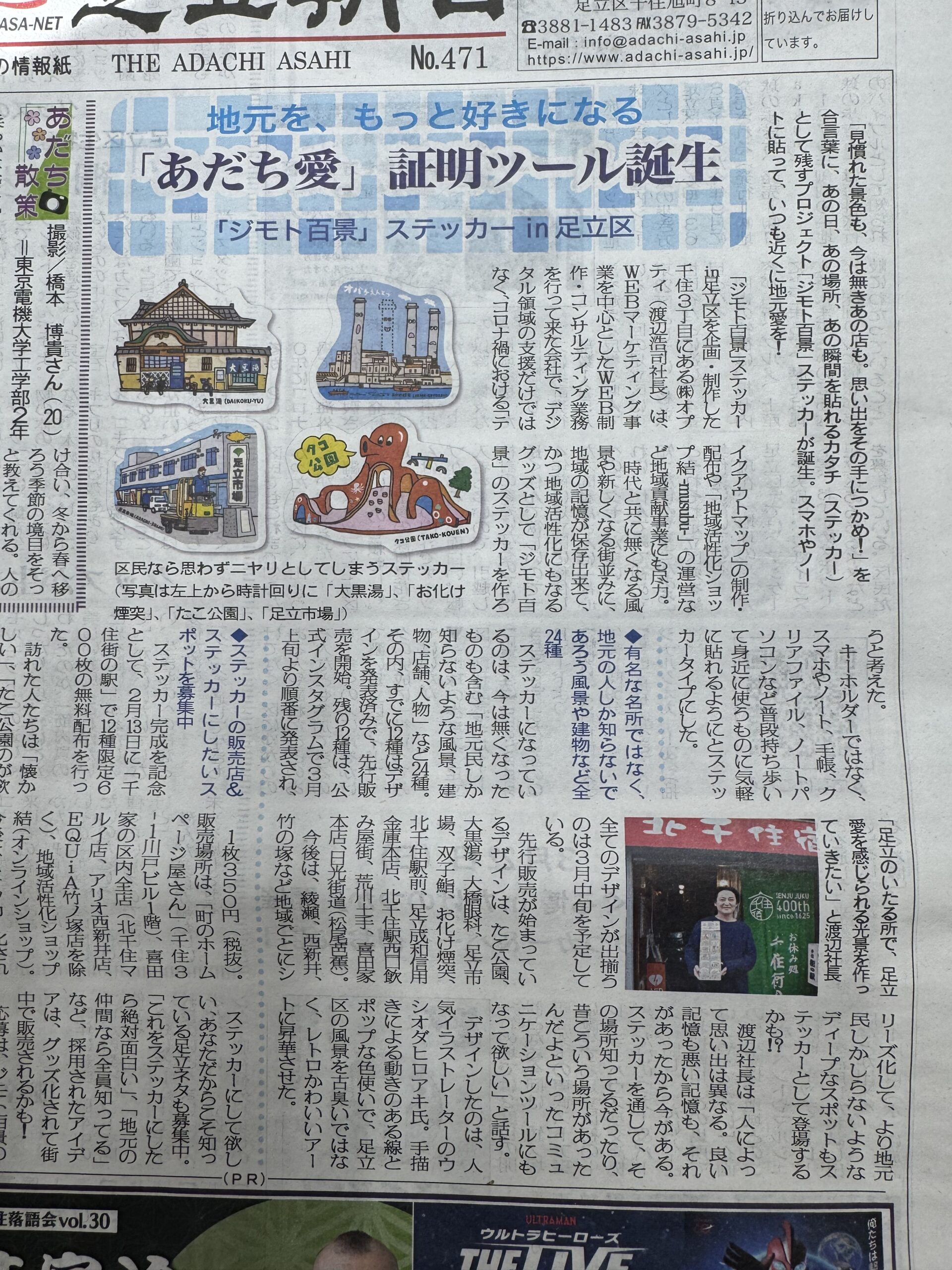 足立区の「地域の記憶」をステッカーとして残すという私たちの試みに、各紙の記者様からも温かい関心を寄せていただき、プロジェクトの背景や制作に込めた想いを深く取材していただきました。